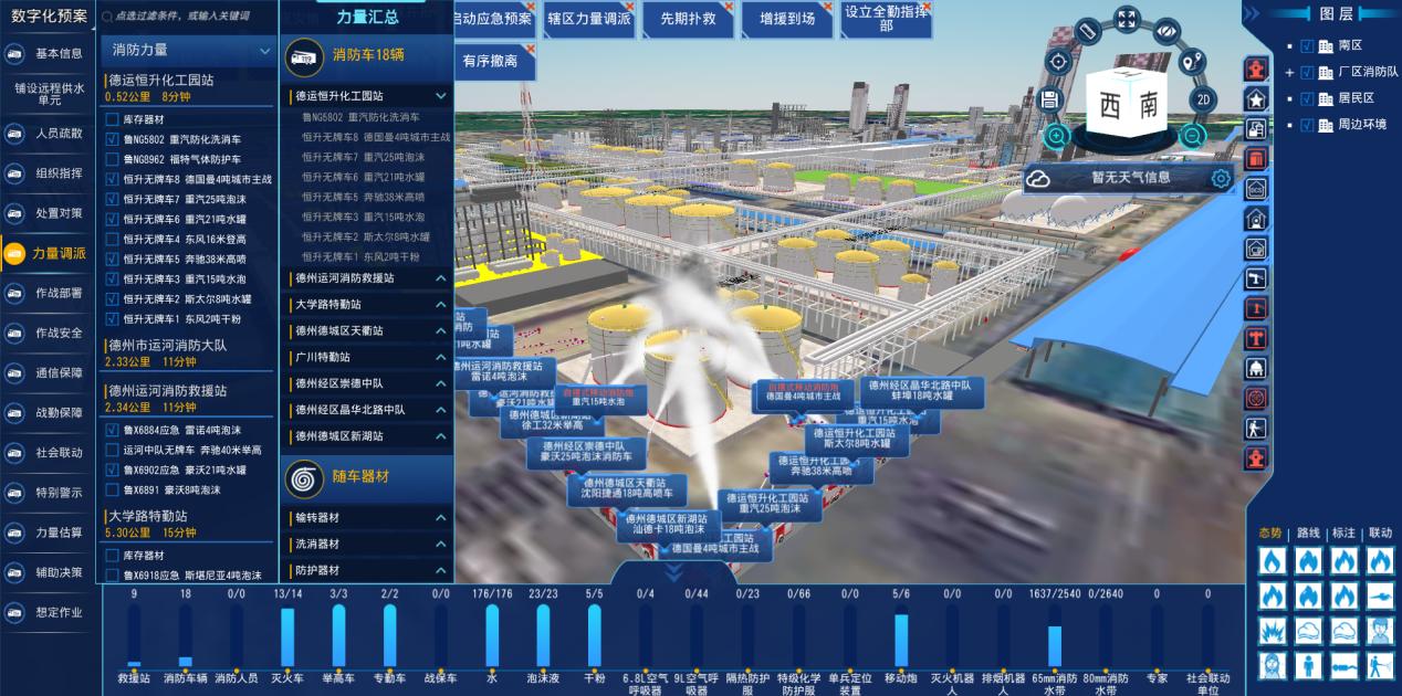 ● 自动生成灭火应用计算数据,包括水带长度、实际用水量、补水量、持续供水时间,实时显示力量态势对比,实时显示调集车辆装备总数和实际使用情况。
