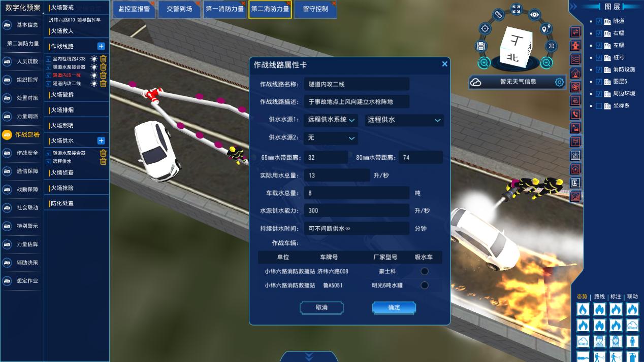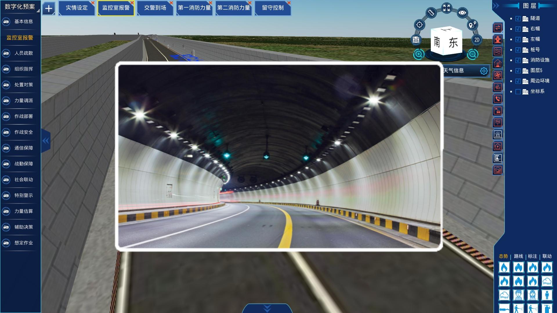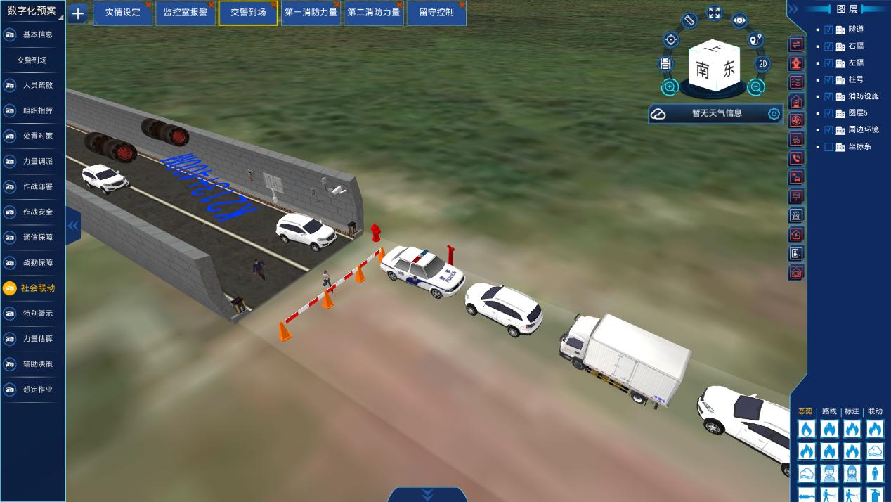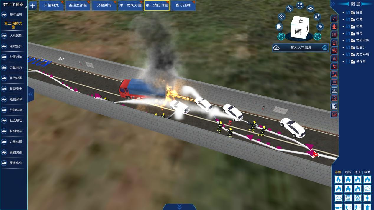3. 隧道数字化应急预案建设 针对隧道高频应急场景,制定 “一情一策”的动态数字化预案,解决传统纸质预案数据信息不关联、管理使用不方便、空间结构不直观、实战辅助不强等问题。预案制作完成后,可生成推演动画,直观展示灾情发展、处置流程、路线规划、行动步骤、处置措施等,便于日常熟悉演练。