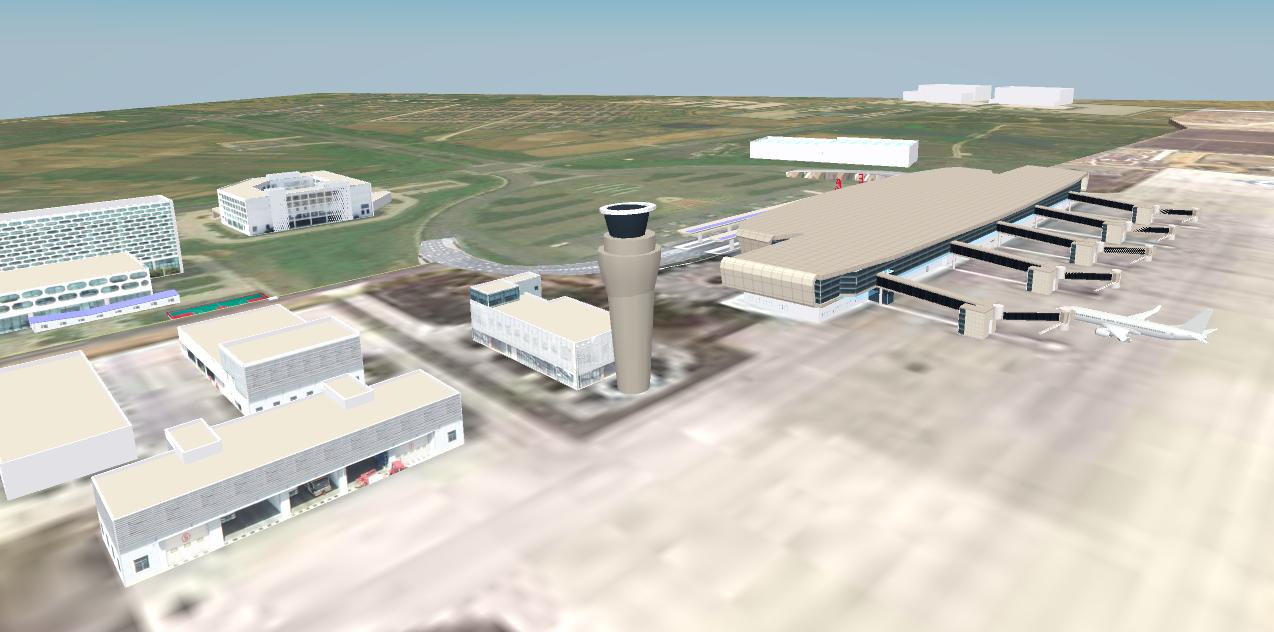 1. 机场全要素三维数字底座建设,应用数字消防系统,1:1复制机场高精度数字孪生模型,航站楼(楼层分布、建筑结构、安全出口、消防通道、电梯/扶梯、商业区域、机房、消防设施等)、跑道/滑行道、机坪(停机位、廊桥、加油点)、货运区、塔台、导航设施、油库等对象;外围区域(进场道路、周边居民区、障碍物限制区、应急疏散集结点)等对象全部数字化。