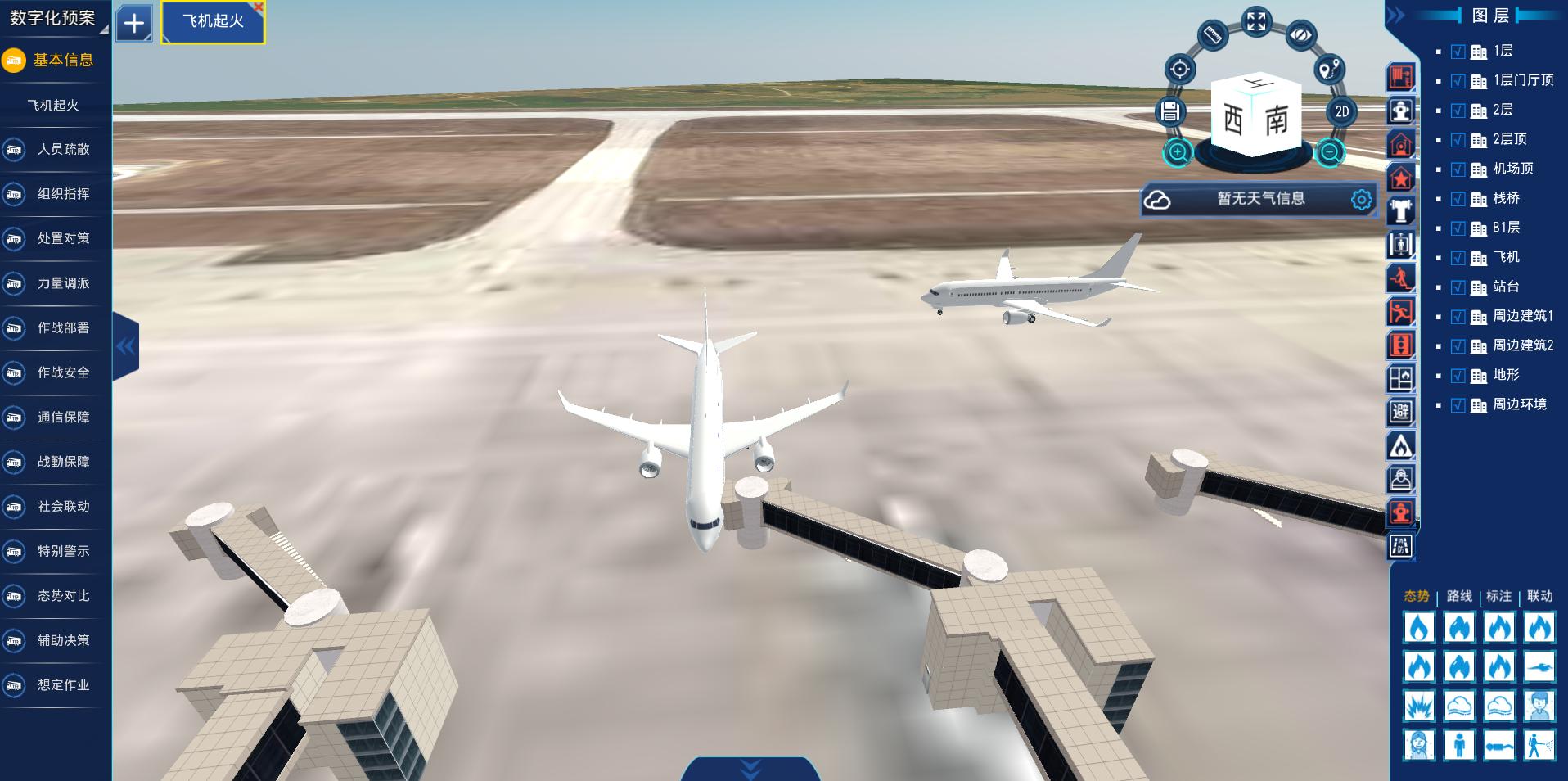 为落实《中国民航四型机场建设行动纲要(2020-2035年)》的任务要求,《民用运输机场应急救援管理规则》、《民航应急演练管理办法》、《民航应急预案管理办法》关于预案编制与演练的工作要求,运用虚拟现实、数字孪生、大数据等技术,搭建机场数字化应急预案平台,提升应急预案的科学性和实战性,实现三维数字化预案与模拟仿真演练的深度融合,提升机场的应急响应速度与决策处置能力。
