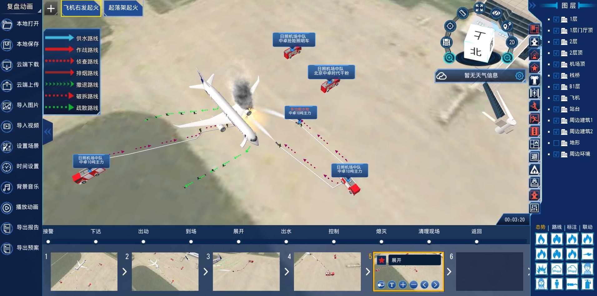 4. 应急预案编制,应用数字化预案云平台实现流程化标准化预案制作管理,支持分别针对机场建筑与飞行器分别制定专题预案,以实际力量进行作战部署,明确作战任务、使用器材、战术战法、作战路线。制定完成的预案还可设置根据作战流程设置场景页生成预案动画,并支持导出文本预案。