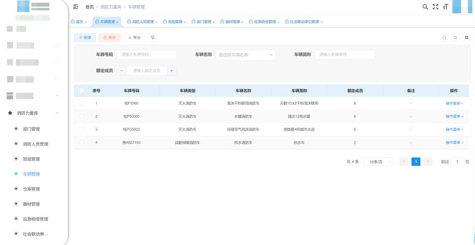 4. 消防力量精细化管理 构建全要素消防力量库,实现人员、装备、物资的数字化管理。通过部门分级管理、人员全生命周期档案及班组智能排班,明晰队伍底数与状态;车辆装备全维度管理及定期检查,实时掌握装备完备率;库存器材、训练器材与应急物资动态盘点,社会联动单位信息一键调取,保障应急资源高效可用。